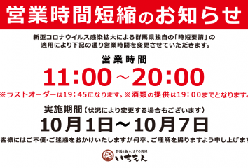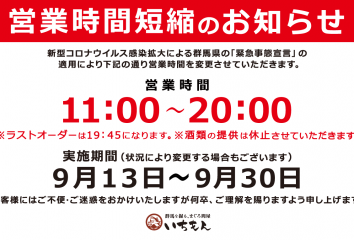 お知らせ 最新情報はこちら FacebookFacebook TwitterTwitter InstagramInstagram すべてお知らせ群馬いちもん金沢まいもん群馬を握る、まぐろ問屋いちもん重要なお知らせ 2022.12.10 年末年始 営業時間変更のお知らせ お知らせ群馬いちもん金沢まいもん群馬を握る、まぐろ問屋いちもん重要なお知らせ 2022.02.14 営業時間短縮期間延長のお知らせ 重要なお知らせ 2022.01.20 営業時間短縮のお知らせ 重要なお知らせ 2021.11.30 臨時休業のお知らせ 重要なお知らせ 2021.10.01 営業時間短縮のお知らせ 重要なお知らせ 2021.09.13 営業時間短縮のお知らせ 重要なお知らせ 1 2 3 > TOPお知らせ重要なお知らせ