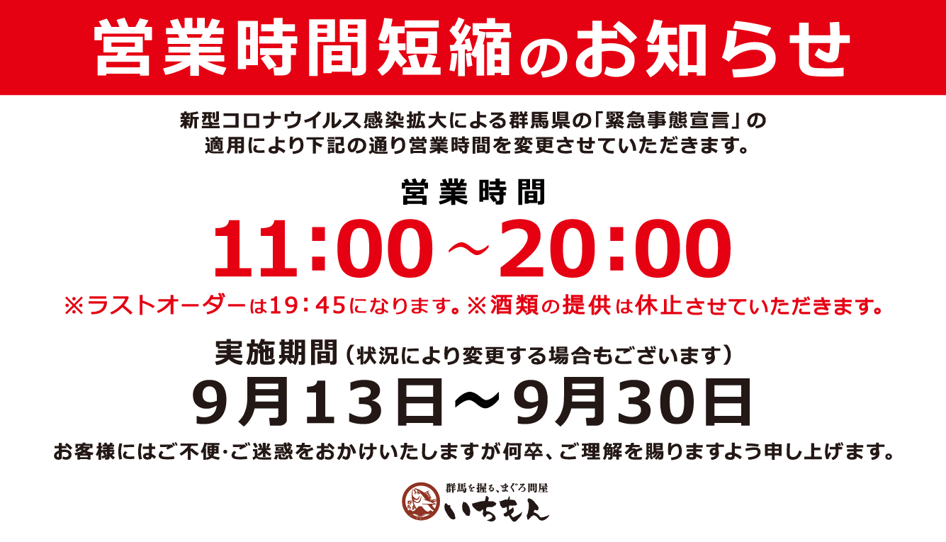 お知らせ 2021.09.13 営業時間短縮のお知らせ 重要なお知らせ 9月13日(月)~9月30日(木)までの期間中、「群馬を握る、まぐろ問屋いちもん」全店舗にて、 通常21:45閉店を20:00閉店とする時短営業を実施いたします。 また、酒類の提供は休止させていただきます。 お客様にはご不便をおかけしますが何卒ご理解とご協力の程よろしくお願い申し上げます。 お知らせ一覧へ戻る