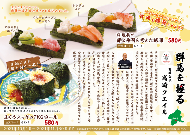 お知らせ 2021.10.01 群馬を握る「高崎クエイル」とうずらの卵がコラボ!10/1(金)~11/30(火) お知らせ 群馬を握る、『高崎クエイル』とのコラボ商品を本日から販売開始! いちもんの寿司ネタで栄養満点なうずらの卵の旨味を引き立てます! 高崎クエイルの美味しいうずらの卵といちもんのコラボ商品をぜひご堪能ください! お知らせ一覧へ戻る