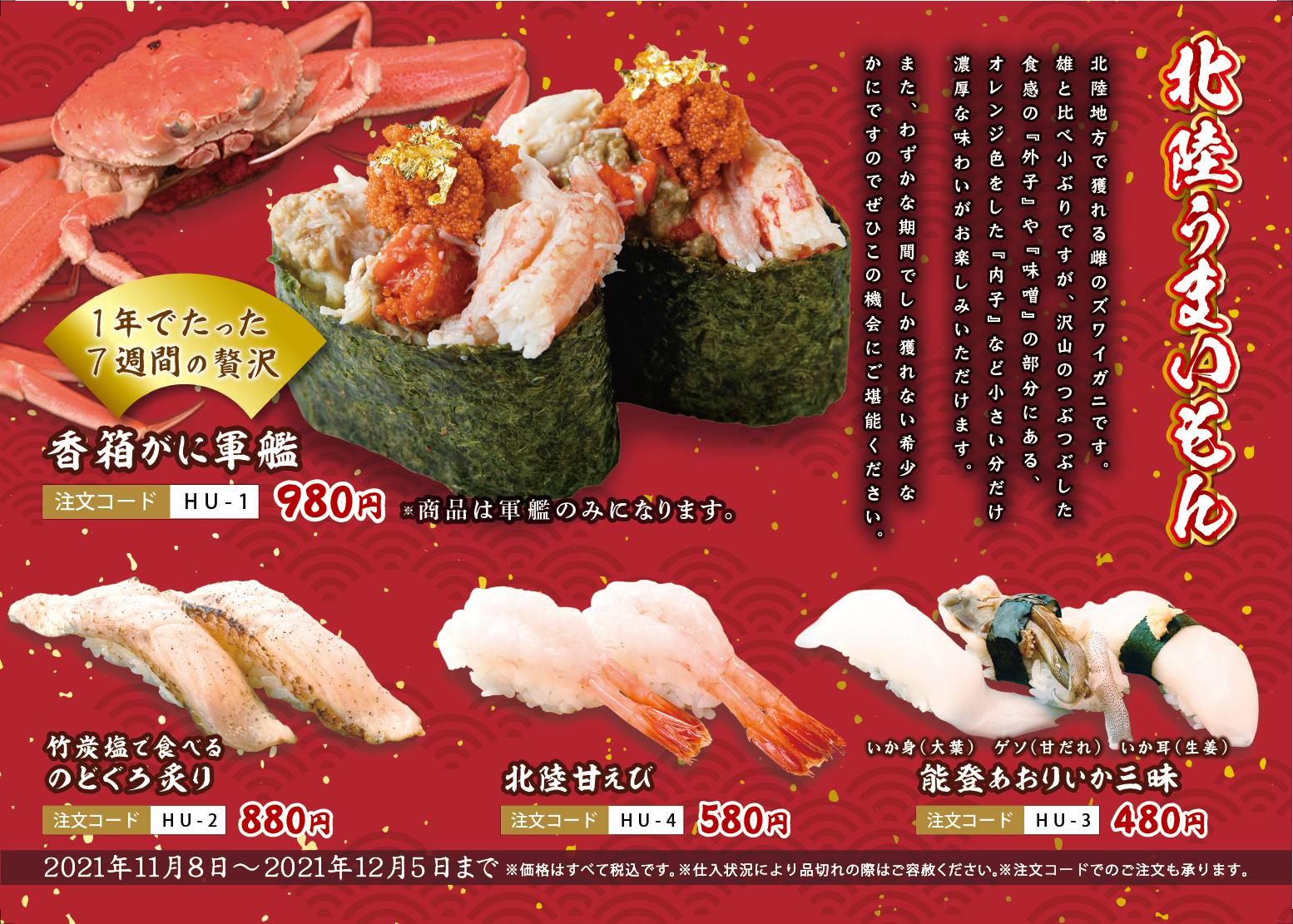 お知らせ 2021.11.08 期間限定!北陸うまいもん 11/8(月)~12/5(日) お知らせ 今回は北陸のうんまい食材を使用したネタをご用意しております。 メインの香箱がには北陸地方で獲れる雌のズワイガニです。 雄と比べ小ぶりですが、沢山のつぶつぶした食感の『外子』や 『味噌』の部分にある、オレンジ色をした『内子』など 小さい分だけ濃厚な味わいがお楽しみいただけます。 また、わずかな期間でしか獲れない希少なかにです! ぜひ、この期間に北陸のうまいもんをご堪能ください! お知らせ一覧へ戻る