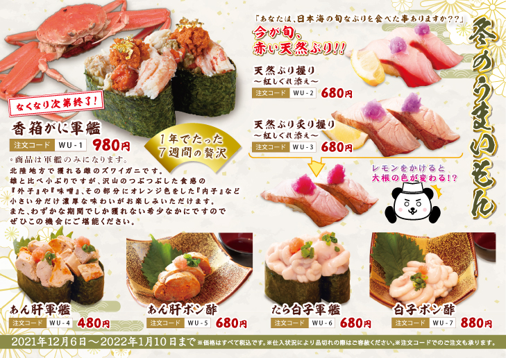 お知らせ 2021.12.06 期間限定!冬のうまいもん 12/6(月)~1/10(月) お知らせ 今回、冬のうまいもんは前回に引き続き香箱がに軍艦、 紫大根にレモンをかけるとピンクに色が変わる天然ぶりやあん肝など 旬のうまい食材をメインにたくさんご用意しております! ぜひ、この期間に「冬のうまいもん」をご堪能ください! お知らせ一覧へ戻る