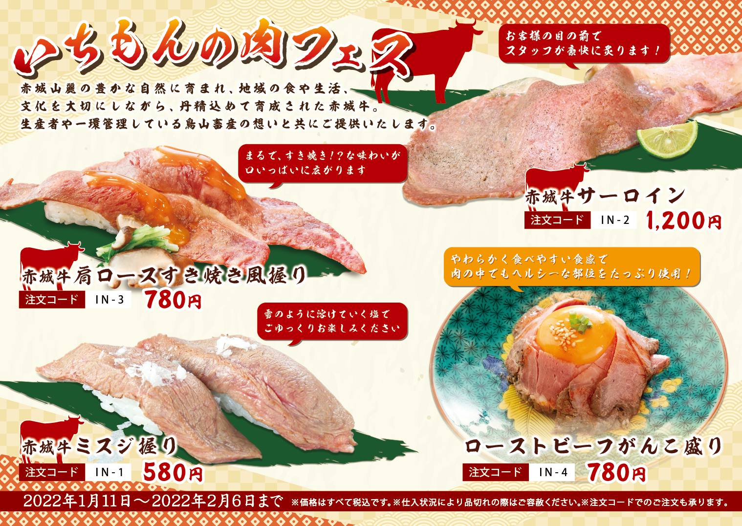 お知らせ 2022.01.11 期間限定!いちもんの肉フェス1/11(火)~2/6(日) お知らせ 今回の期間限定商品は魚ではなく、肉です! 赤城山麓の豊かな自然で育まれた、群馬のブランド牛「赤城牛」。 目の前で豪快に炙るサーロイン、一貫で完成された旨みのすき焼き風握り。 希少部位のミスジ握りなど群馬が誇る名産が織りなす肉寿司をお楽しみください。 お知らせ一覧へ戻る
