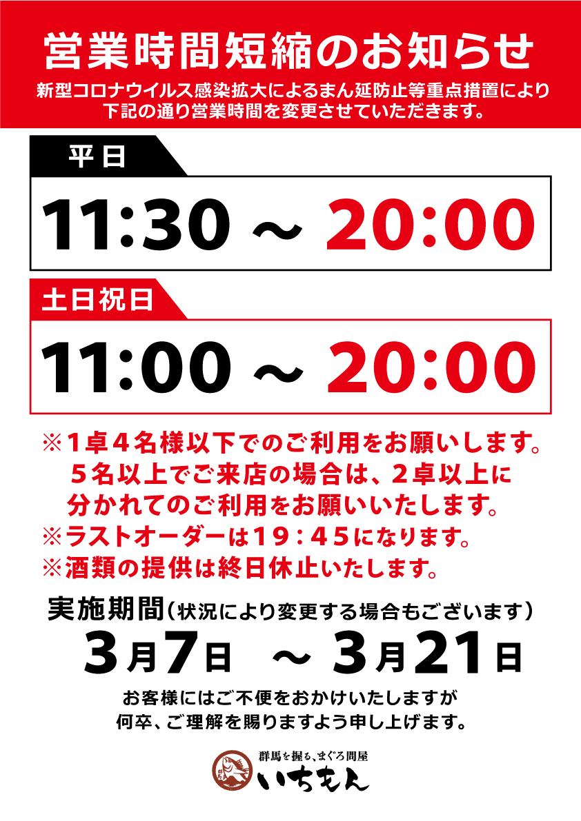 群馬県のまん延防止等重点措置適用期間延長を受け、要請期間中は下記の通り営業を変更いたします。