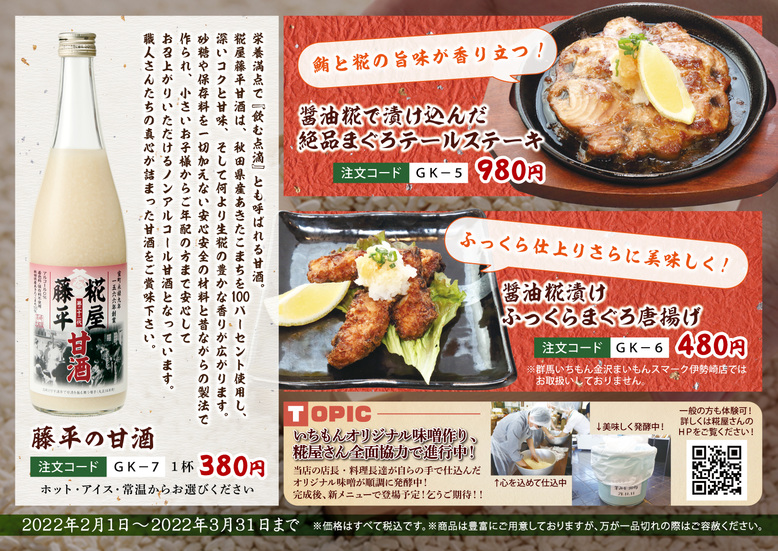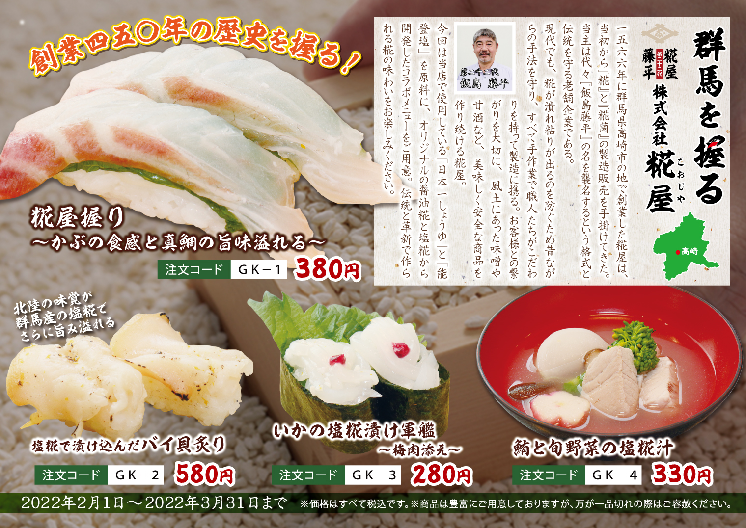 お知らせ 2022.03.30 大好評につき販売期間延長!!群馬を握る「糀屋」4/30(土)まで お知らせ 大好評につき販売期間延長!! 4月30日(土)まで販売期間を延長いたします!! 創業450年、伝統の手作りを守りながらも新商品開発にも積極的に取り組む同社。 今回は、当店で使用している「日本一しょうゆ」を原料に使用した醤油糀と 「能登塩」を原料に使用した塩糀を新たに開発していただきました! 糀の香りと深い旨みが加わりさらに美味しくなった寿司をご堪能ください。 お知らせ一覧へ戻る