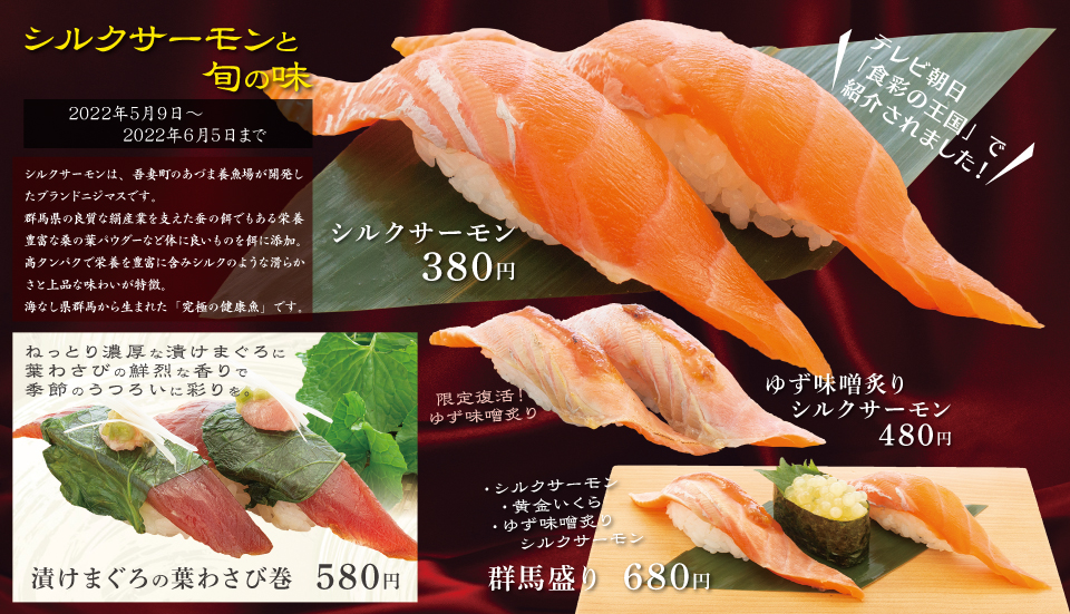 お知らせ 2022.05.08 上州ブランド「シルクサーモン」5/9~6/5販売 お知らせ 4/30放送の食彩の王国(テレビ朝日)でも紹介されたシルクサーモンを期間限定販売! シルクサーモンは、あづま養魚場の三代目池田駿介さんが、エサの改良から取り組み作り上げ、昨年商標登録も果たした群馬生まれのブランド魚です。その大型の魚体に良質な植物性の脂肪酸を蓄え、味わいとともに健康にも良いと注目されています。 まだまだ生産量の少ない希少な上州ブランド魚をぜひお楽しみください。 ※入荷状況により品切れの際はご容赦ください。 当日の販売状況はお気軽に店舗までお電話にてお問い合わせください。 お知らせ一覧へ戻る