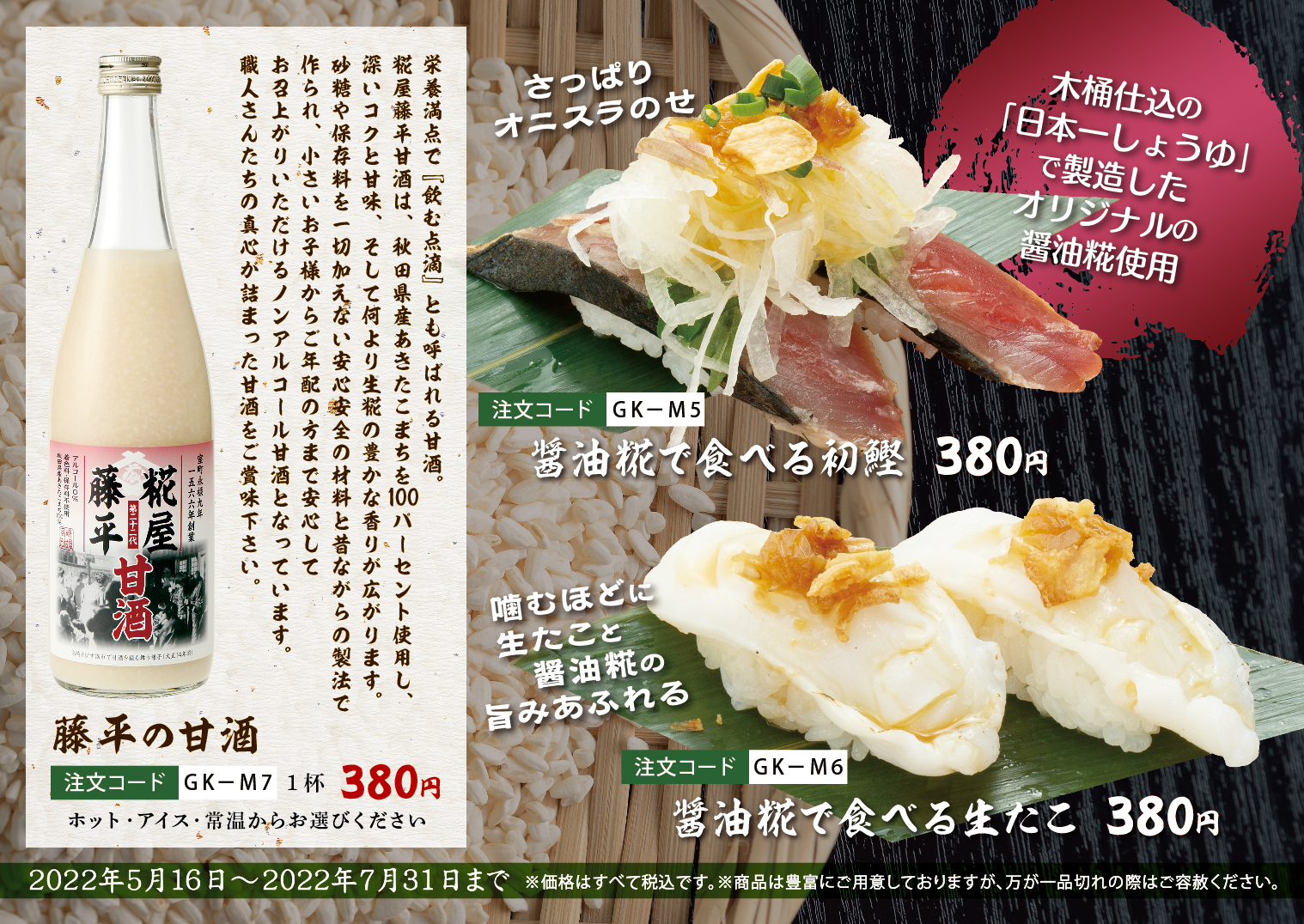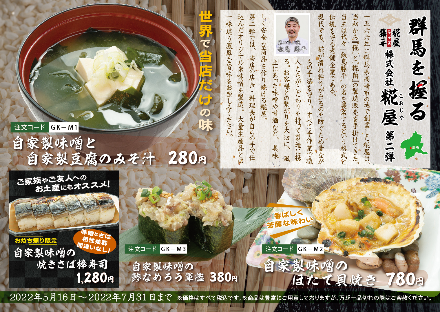 お知らせ 2022.05.15 群馬を握る「糀屋」第二弾 5/16~7/31販売 お知らせ 4/30まで販売し大好評を博した群馬を握る「糀屋」。 同社全面協力の元、当店店長・料理長が自らの手で仕込んだ 【自家製味噌】がこの度ついに完成いたしました! こだわりの素材と手作りが生み出す濃厚ながら自然で優しい味わいを 余すところなくお楽しみ頂ける期間限定メニューを多数ご用意! 創業450年を超える伝統と当社職人の真心が込められた 期間限定販売メニューをお見逃しなく!! お知らせ一覧へ戻る