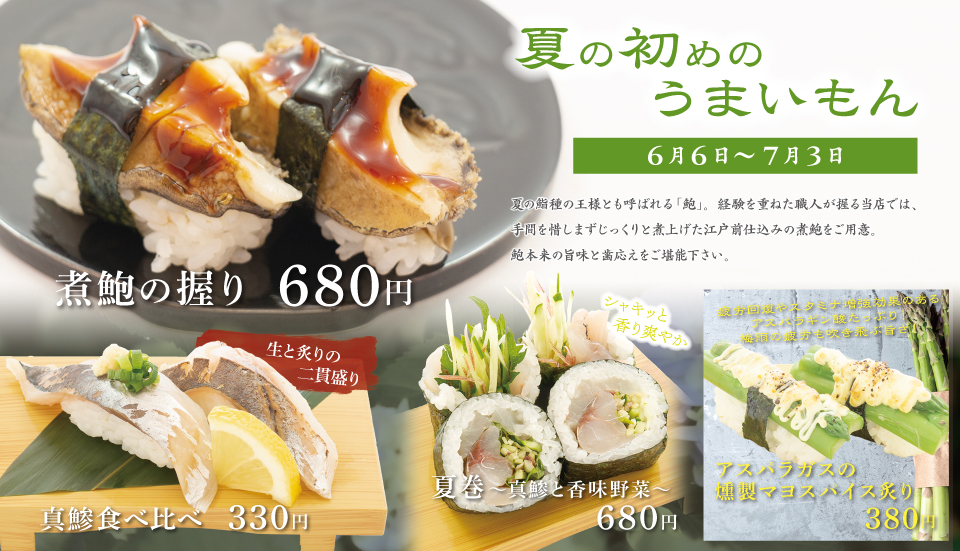 お知らせ 2022.06.05 夏の初めのうまいもん 6/6-7/3 お知らせ 夏の鮨種の王様とも呼ばれる「鮑」。 職人が握る当店では、手間を惜しまずじっくりと煮上げた江戸前仕込みの煮鮑をご用意。 鮑本来の旨味と歯応えをぜひご堪能ください。 旬の真鯵も脂がのって最高潮!握りはもちろん、香味野菜と巻いた夏巻の爽やかな美味しさは この季節にピッタリの味わいです。 夏の初めのうまいもんはいちもんで! お知らせ一覧へ戻る