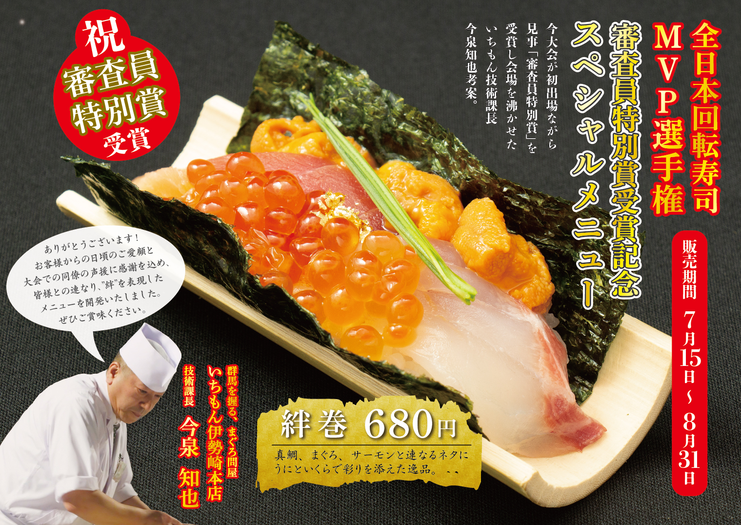 お知らせ 2022.07.15 職人MVP選手権審査員特別賞受賞記念メニュー発売! お知らせ 第七回 全日本回転寿司MVP選手権の審査員特別賞受賞を記念して 受賞した今泉技術課長考案の限定商品「絆巻」を発売いたします。 日頃のご愛顧に感謝を込めた特別なメニューをぜひお楽しみください。 お知らせ一覧へ戻る