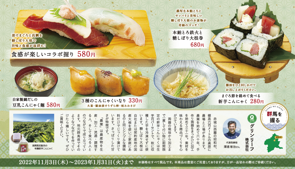 この度、コラボレーションする農業生産法人グリンリーフ株式会社は、赤城山西麓の農場と工場をはじめとする拠点で生産する有機農産物や特別栽培農産物を、有機こんにゃくや素材を活かした漬物、有機冷凍野菜、お料理セットなどに加工して販売しています。中でも、こんにゃく芋の風味と昔ながらの食感を守る手作り蒟蒻や、ご家庭にあるのと同様の調味料のみで採れたて野菜の味を引き出す漬物にファンが多く、今回のコラボレーションでは、寒い季節に旬を迎える新芋こんにゃくと糖しぼり大根など、グリンリーフの看板商品を使って、「群馬を握るシリーズ」メニューを開発いたしました。