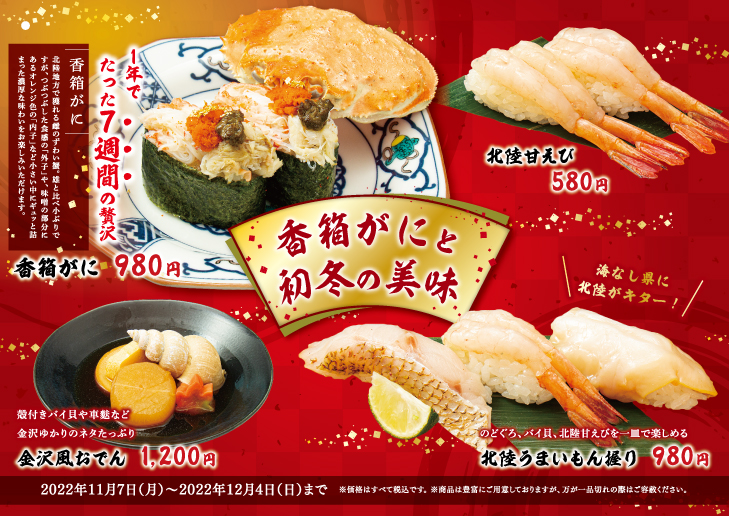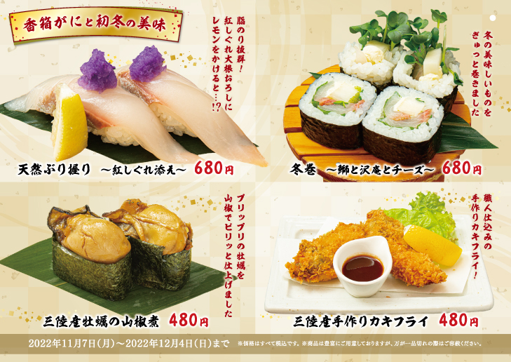 11/7(月)から12/4(日)まで期間限定メニュー「香箱がにと初冬の美味」を、