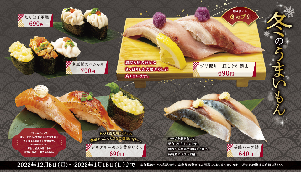 お知らせ 2022.12.05 冬のうまいもん 12/5~1/15 お知らせ 12月5日(月)~期間限定「冬のうまいもん」販売! 脂乗り抜群の冬のぶりを紅しぐれ大根添えでサッパリと! 長崎県産のブランド鯖「ハーブ鯖」も入荷。飼料にハーブを加え徹底した管理の元育てられたハーブ鯖は、臭みが無くたっぷり乗った脂の旨みが絶品です。 その他たらの白子など冬の味覚が勢ぞろい! 冬のうまいもんはいちもんでぜひお楽しみください♪ お知らせ一覧へ戻る