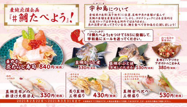 お知らせ 2021.02.22 地域応援企画開催2/22~3/31まで お知らせ 本日から宇和島の産地応援企画を開催いたします! 握りだけでなく、かぶとを使用したお料理もご用意しております。 「#鯛たべよう」をSNSに投稿して宇和島にエールを送りましょう! ぜひ、宇和島産の鯛をご堪能ください。 お知らせ一覧へ戻る