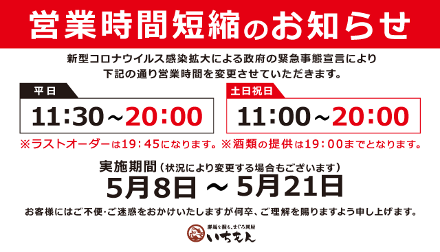 お知らせ 2021.05.08 営業時間変更のお知らせ 重要なお知らせ 群馬を握る、まぐろ問屋いちもん全店舗にて、群馬県からの要請に基づき、通常21:45閉店を 20:00閉店とする時短営業を実施いたします。 また、酒類の提供は19:00までとさせて頂きます。 お客様にはご不便をおかけしますが何卒ご理解の程よろしくお願い申し上げます。 お知らせ一覧へ戻る