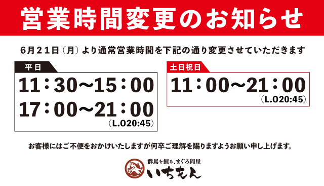 お知らせ 2021.06.21 営業時間変更のお知らせ 重要なお知らせ 2021年6月21日(月)よりいちもん全店、営業時間を下記の通り変更させていただきます。 ■平日 11:30〜15:00 / 17:00〜21:00(20:45L.O) ■土日祝 11:00〜21:00(20:45L.O) お知らせ一覧へ戻る