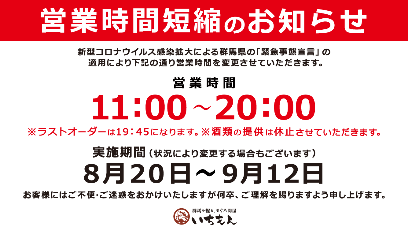 お知らせ 2021.08.20 営業時間短縮のお知らせ 重要なお知らせ 8月20日(金)~9月12日(日)までの期間中、「群馬を握る、まぐろ問屋いちもん」全店舗にて、 通常21:45閉店を20:00閉店とする時短営業を実施いたします。 また、酒類の提供は休止させていただきます。 お客様にはご不便をおかけしますが何卒ご理解とご協力の程よろしくお願い申し上げます。 お知らせ一覧へ戻る