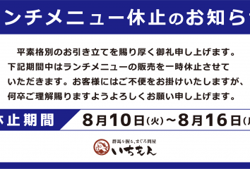 お知らせ 最新情報はこちら FacebookFacebook TwitterTwitter InstagramInstagram すべてお知らせ群馬いちもん金沢まいもん群馬を握る、まぐろ問屋いちもん重要なお知らせ 2021.08.17 第7回まぐろ工場直売会開催のお知らせ お知らせ 2021.08.14 大好評!「五色のおもてなし」 お知らせ 2021.08.12 営業時間短縮のお知らせ 重要なお知らせ 2021.08.10 ランチメニュー休止のお知らせ 重要なお知らせ 2021.08.09 期間限定!いちもんの夏 8/9~9/5 お知らせ 2021.08.07 営業時間短縮のお知らせ 重要なお知らせ < 1 … 6 7 8 9 10 11 12 13 14 15 > TOPお知らせ